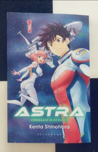 “Verdwaald in de ruimte” is het eerste deel van de vijfdelige mangaserie Astra van Kenta Shinohara. Deze sci-fi survivalmanga, gericht op de shōnen-doelgroep, won in 2019 de prestigieuze Manga Taishō Award. Het verhaal volgt negen scholieren die 5.000 lichtjaar van huis gestrand zijn en moeten samenwerken om te overleven en een weg terug te vinden. Hoewel de personages elkaar dan nog nauwelijks elkaar